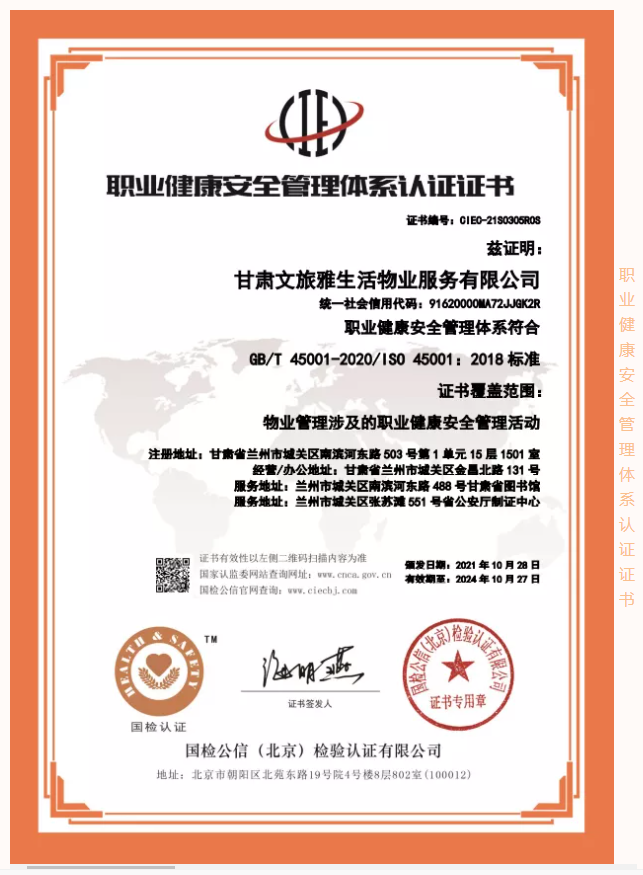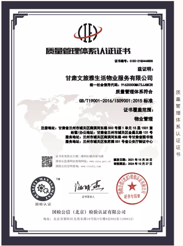 2021年,甘肅文旅雅生活物業服務有限公司認真貫徹落實習近平新時代中國特色社會主義思想,堅決落實集團公司各項決策部署。按照集團公司高質量發展要求,結合自身發展需要,公司于9月份正式啟動3A體系認證工作,經過權威認證機構對公司信用管理、制度建設、管理體系等方面綜合評估,10月底公司順利通過3A體系認證,使得公司在管理水平、制度建設方面有了進一步完善及提升,增強了公司核心競爭力和品牌影響力,為公司高質量發展奠定了堅實的基礎。