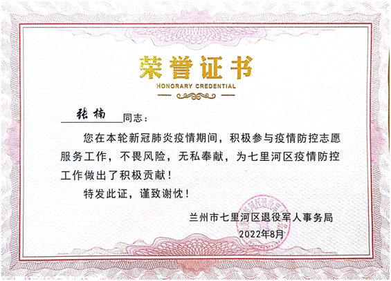 2月10日,蘭州市政建設集團第一工程公司收到蘭州市退役軍人服務中心發來的一封感謝信,對黨員張楠同志在疫情期間勇于擔當防疫志愿服務做出的積極貢獻表示崇高的敬意和衷心的感謝。張楠同志在新冠病毒疫情防控工作的關鍵時期,踴躍參加蘭州“天河救援隊”,奮勇當先、沖鋒向前,踐行了“奉獻、友愛、互助、進步”的志愿服務精神,為群眾筑起了疫情防控安全線。