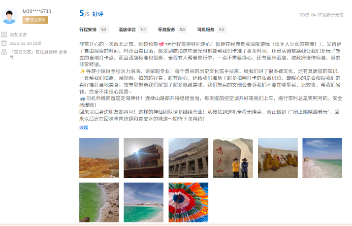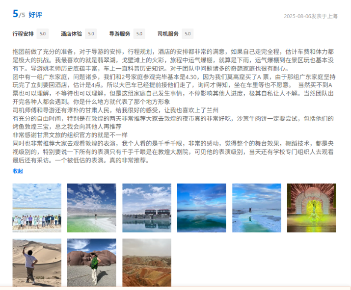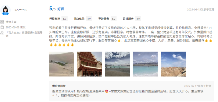 文旅國(guó)旅深度整合甘青兩地的經(jīng)典與小眾旅游資源,精心打造、上線行程豐富、體驗(yàn)舒適產(chǎn)品的同時(shí)南京運(yùn)營(yíng)中心緊密?chē)@游客核心需求,協(xié)同配備金牌工作人員隨團(tuán)提供專業(yè)講解與服務(wù),獲得廣泛好評(píng)。平臺(tái)數(shù)據(jù)顯示,近半年以來(lái),其攜程店鋪訂單量同比增長(zhǎng)超過(guò)40%,訂單完成率高達(dá)98.5%,展現(xiàn)出高度的市場(chǎng)認(rèn)可與出色的運(yùn)營(yíng)效能。用戶口碑方面,店鋪好評(píng)率持續(xù)穩(wěn)步提升,目前已達(dá)4.9分,累計(jì)精選好評(píng)超千條,“質(zhì)量可信、服務(wù)可依”的品牌形象日益凸顯。