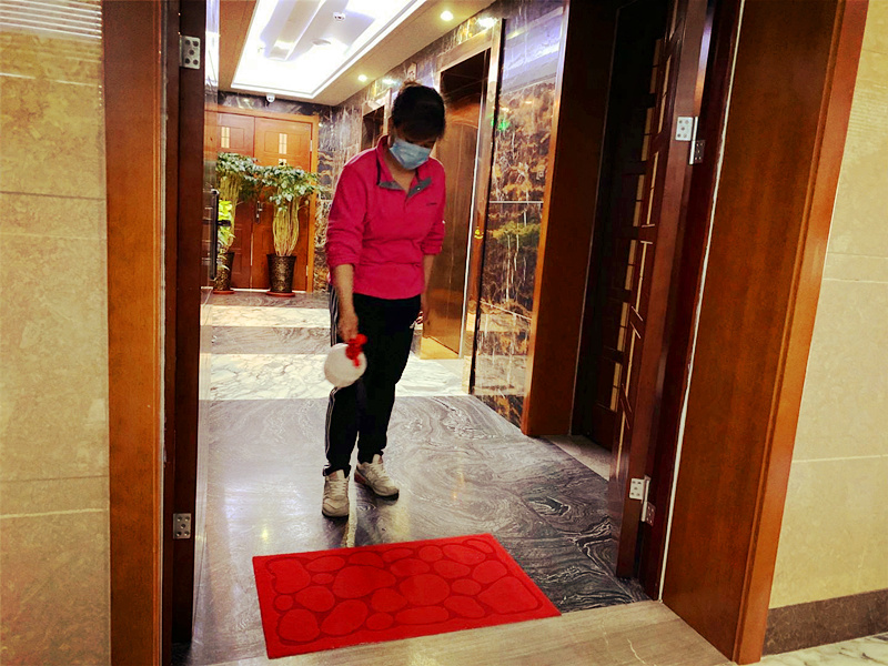 工作人員提前對辦公室、會議室、飯堂等公共區域進行無死角消毒,并重點對門把手、設施按鍵、樓梯通道等公共重點部位進行多次消毒,在辦公區入門位置放置鞋底消毒墊。