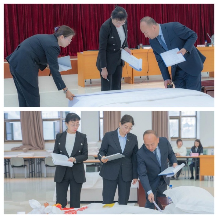 評委們認真檢查選手做床完成情況,從鋪床準(zhǔn)備、操作規(guī)范等方面進行綜合評判。
